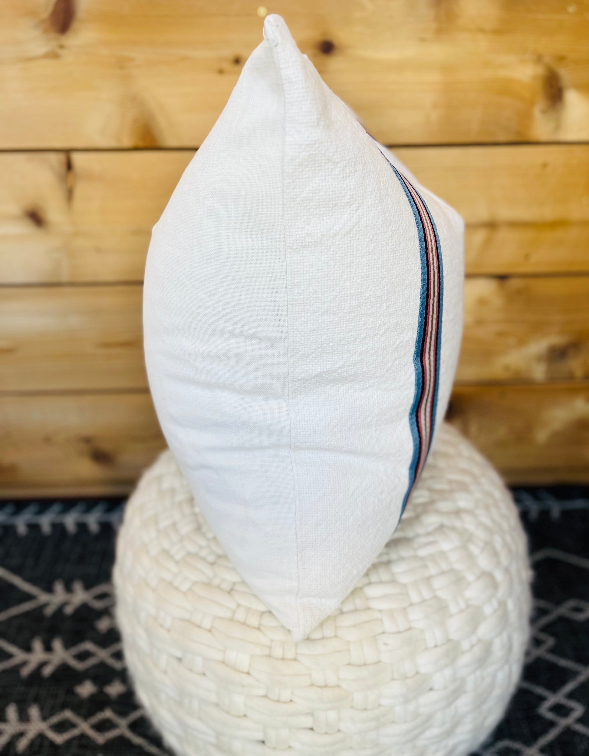 This cotton and Belgian linen pillow features a woven polyester tape applique on a textured solid base.