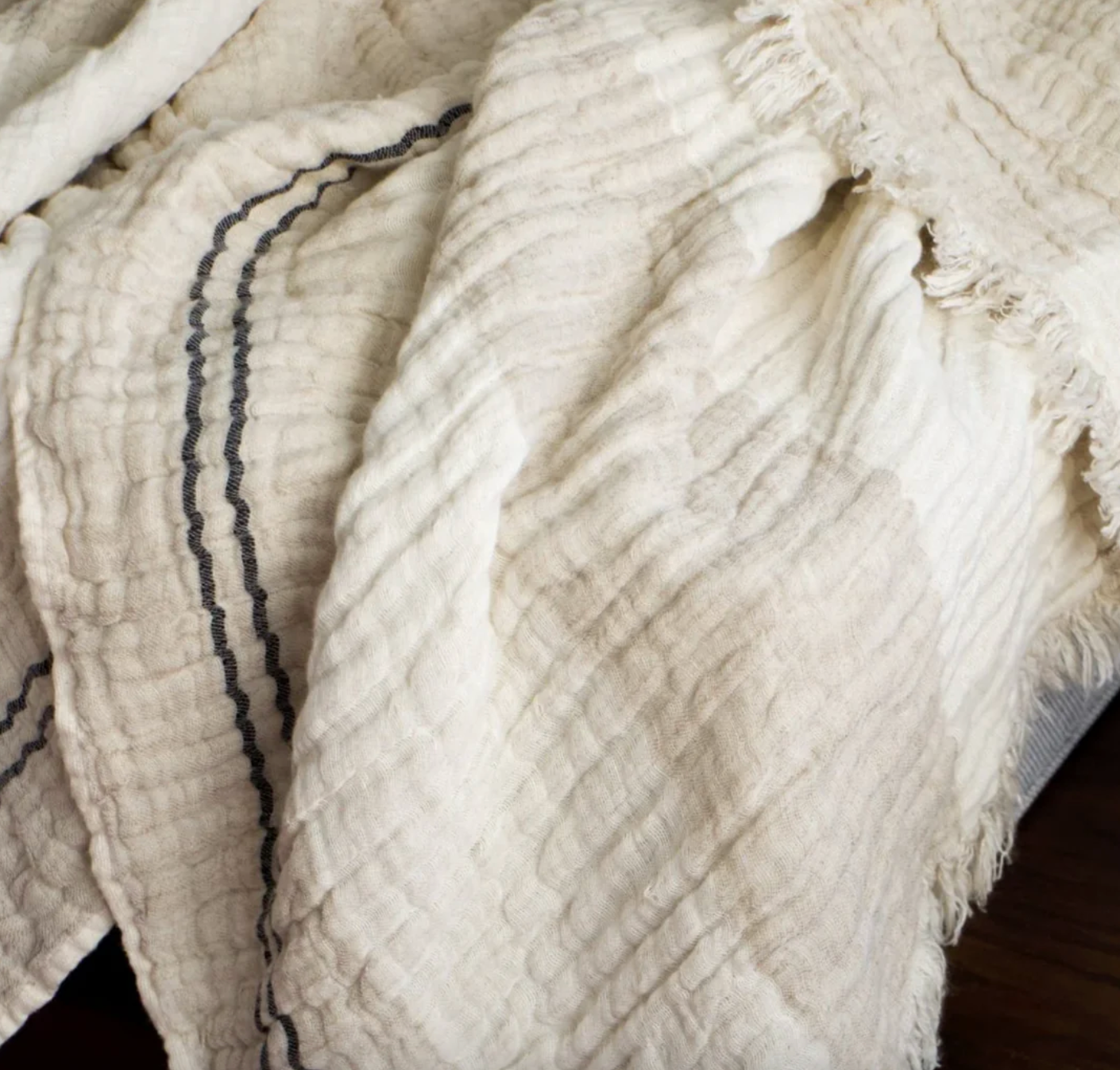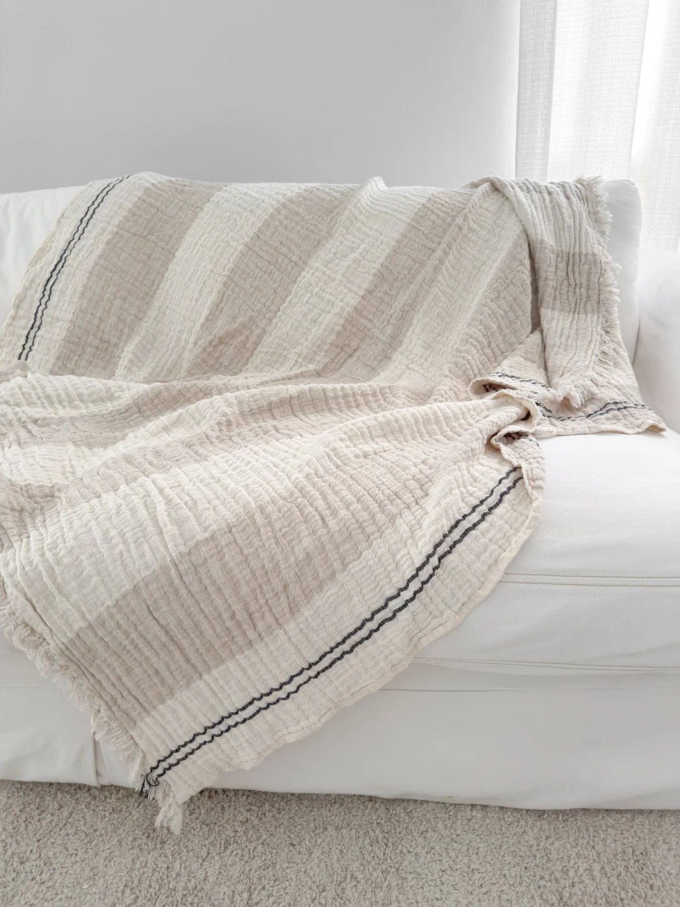 The Crinkled Luxe Linen Stripe Throw is made with soft linen which is naturally breathable. The soft crinkled pattern is mixed with black stripes woven on the border. This blanket will style effortlessly from season to season.