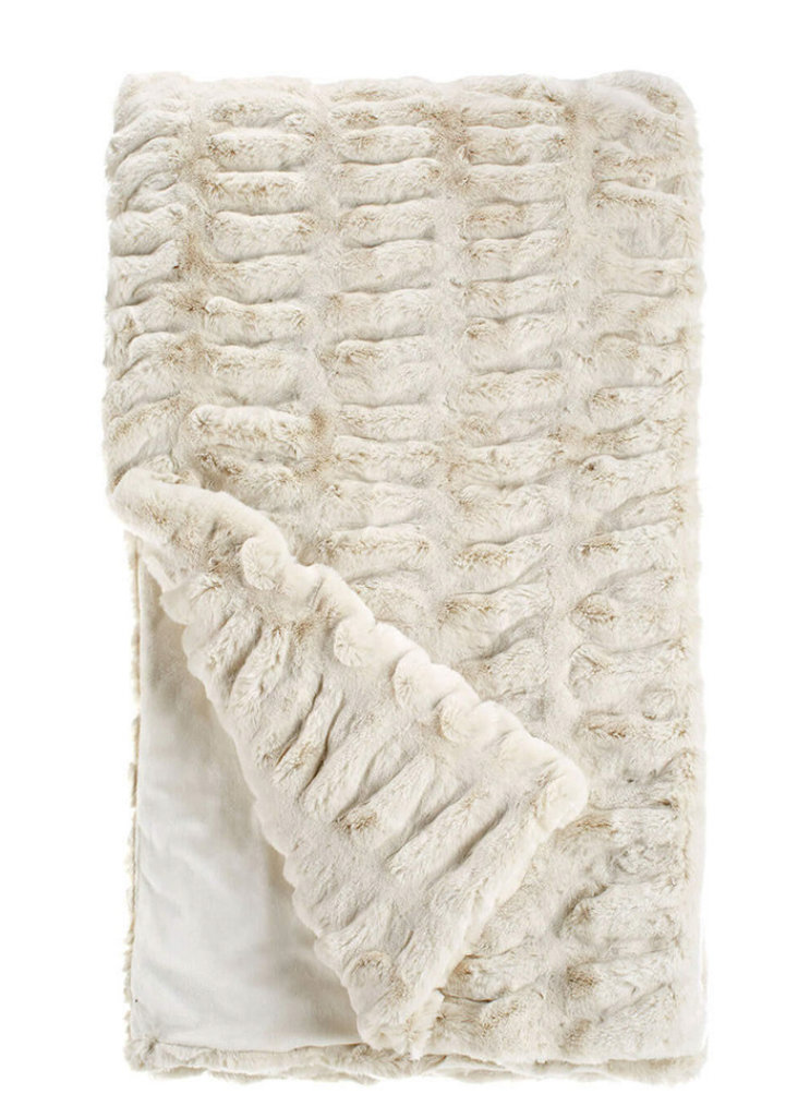 Even your bones are cold? Invite our Ivory Mink throw to become your best friend! Experience the soothing warmth of a fur that exudes comfort, peace and tranquility, even if YOUR winter lasts ten months, thanks to a partner who keeps the A/C crazy-low. Breathe a grateful sigh as you settle under this lush, luxe fur, further enhanced with ruching. The tucks and pleats that create texture and a fluid, liquid hand, ruching adds even more depth and richness to Mink.Â