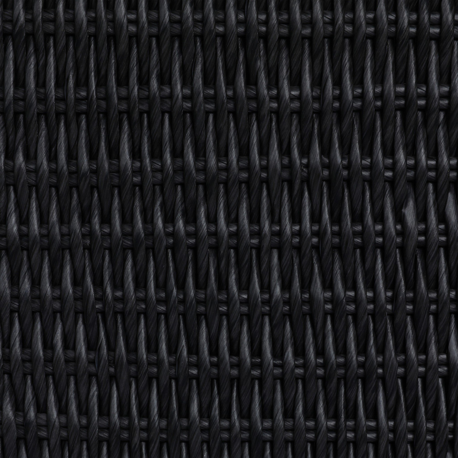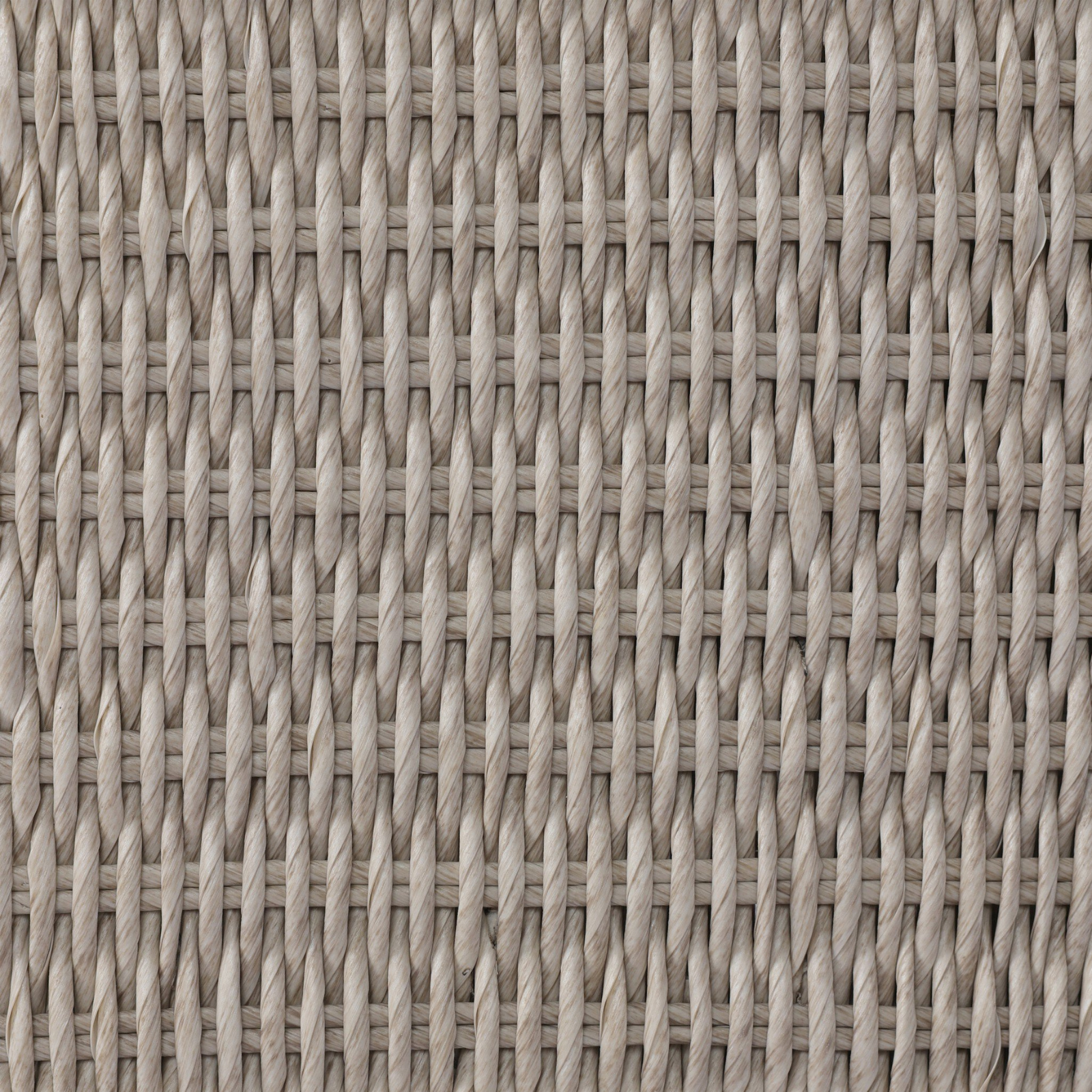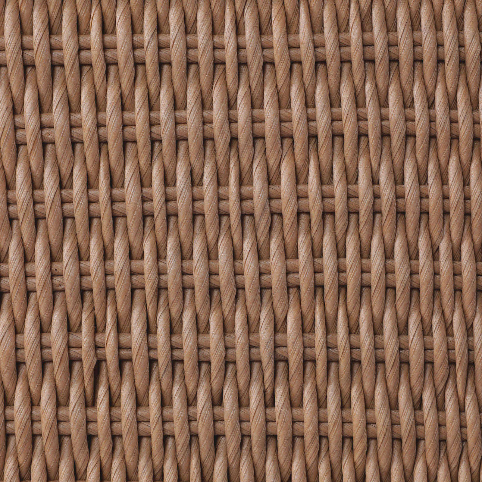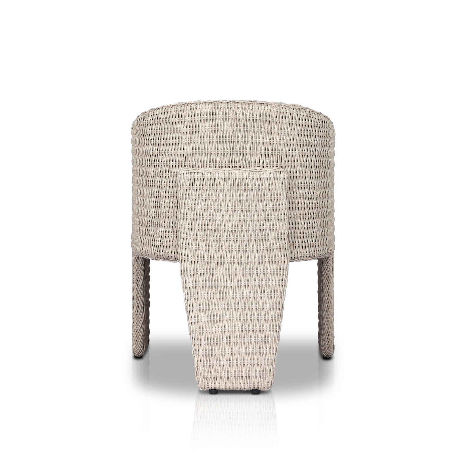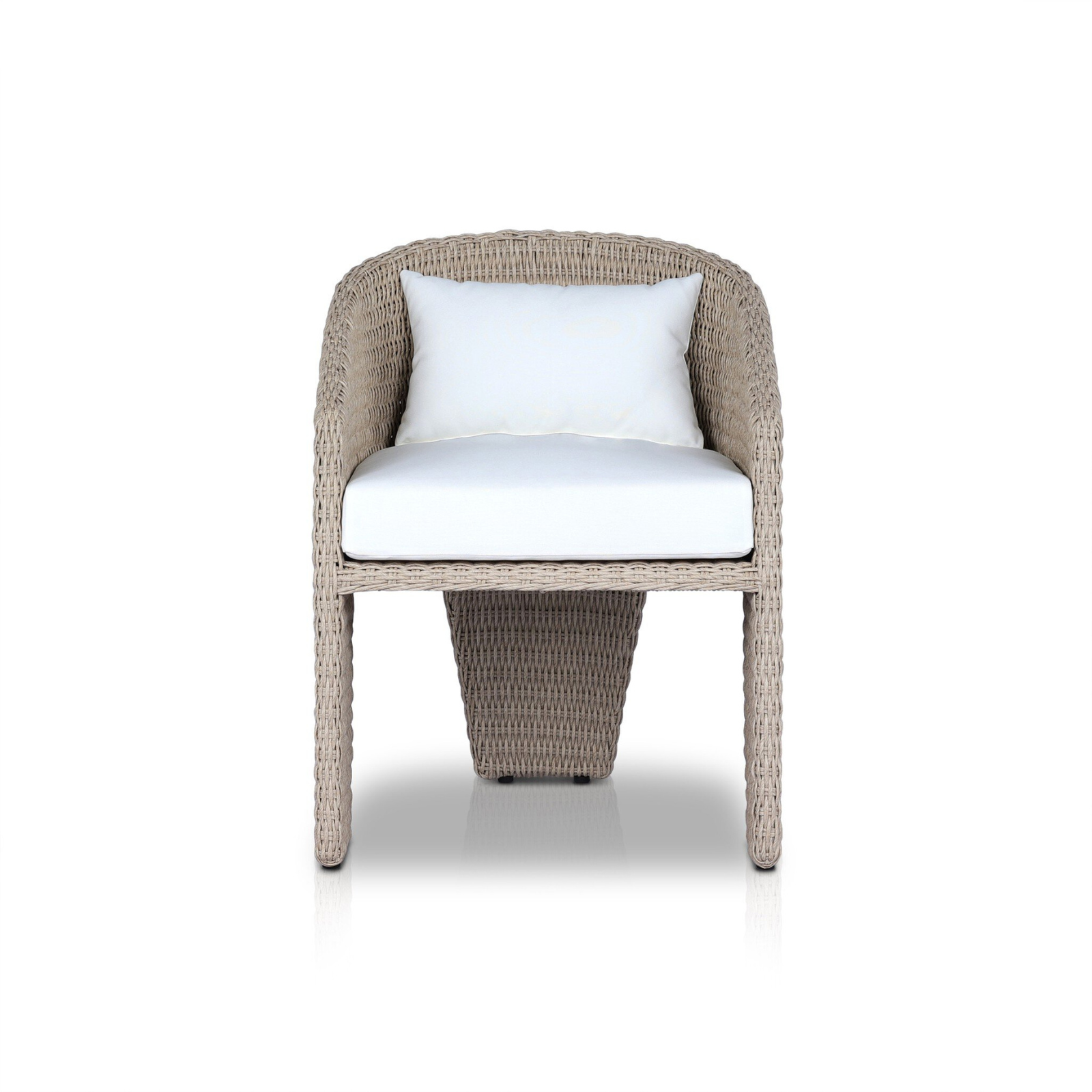 A unique three-leg outdoor dining chair based on the popular indoor silhouette. All-weather wicker framing forms a barrel-shaped back and kick back detail on the leg, accented by a box seat cushion with knife edge back cushion. Covered in 100% olefin, known for its UV-resistant, water-repellent and quick-drying abilities. Cover or store indoors during inclement weather and when not in use. Our Weatherproof Outdoor Dining Chair Cover in size large fits this chair.