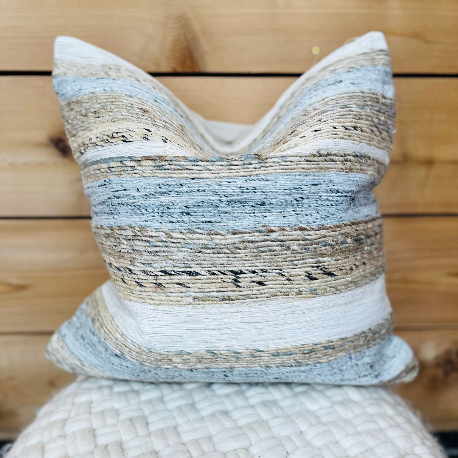 This handcrafted ivory cotton and linen pillow is embroidered with yarn in the front and back, featuring multi color and texture.