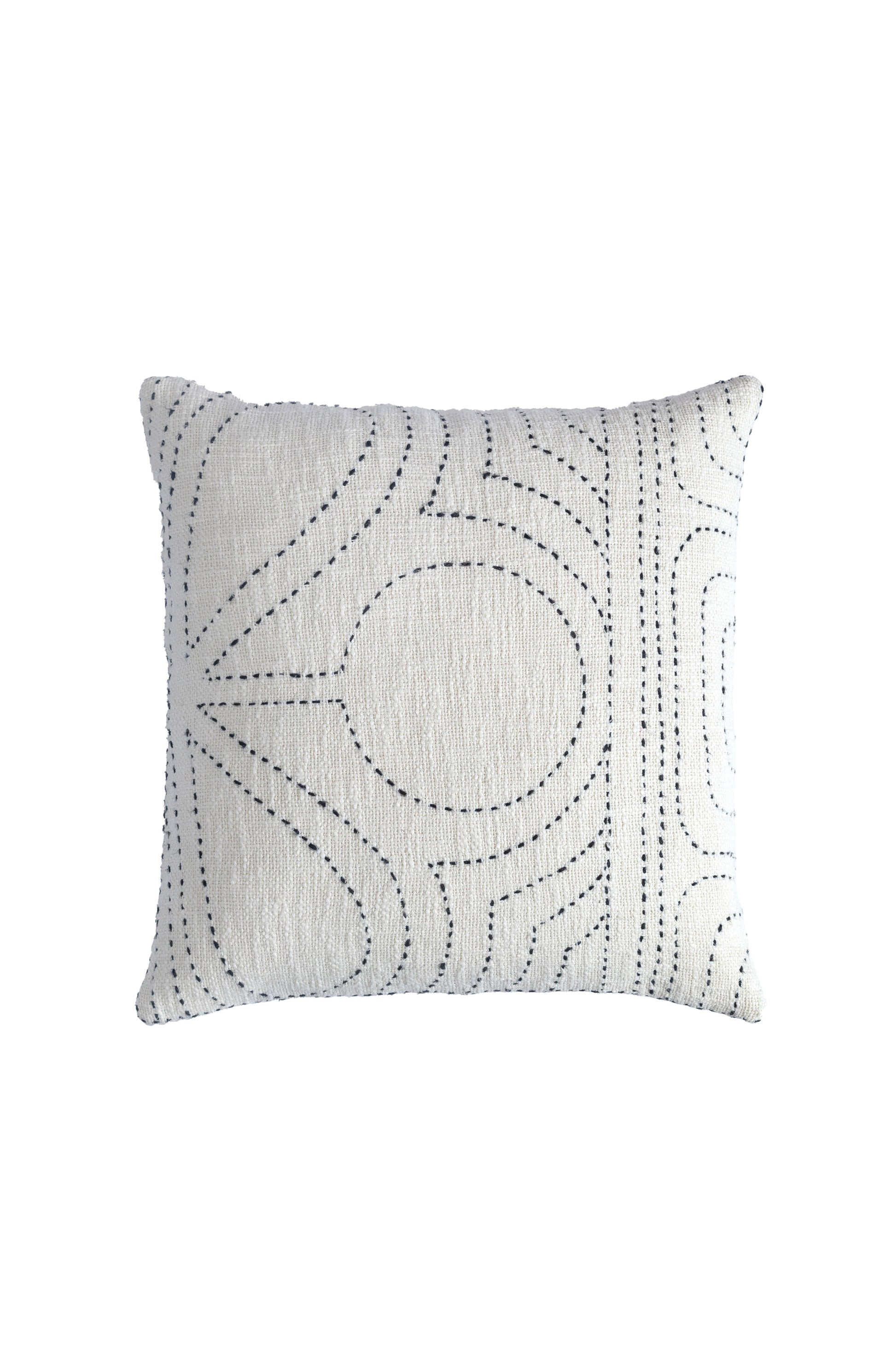 This pillow is created with an intricate hand kantha embroidery process on slubby cotton. The overall pattern of bold motifs on a natural background gives the design a graceful look. Each piece is hand washed to achieve a soft and relaxed textural appeal and enclosed with a brass zipper