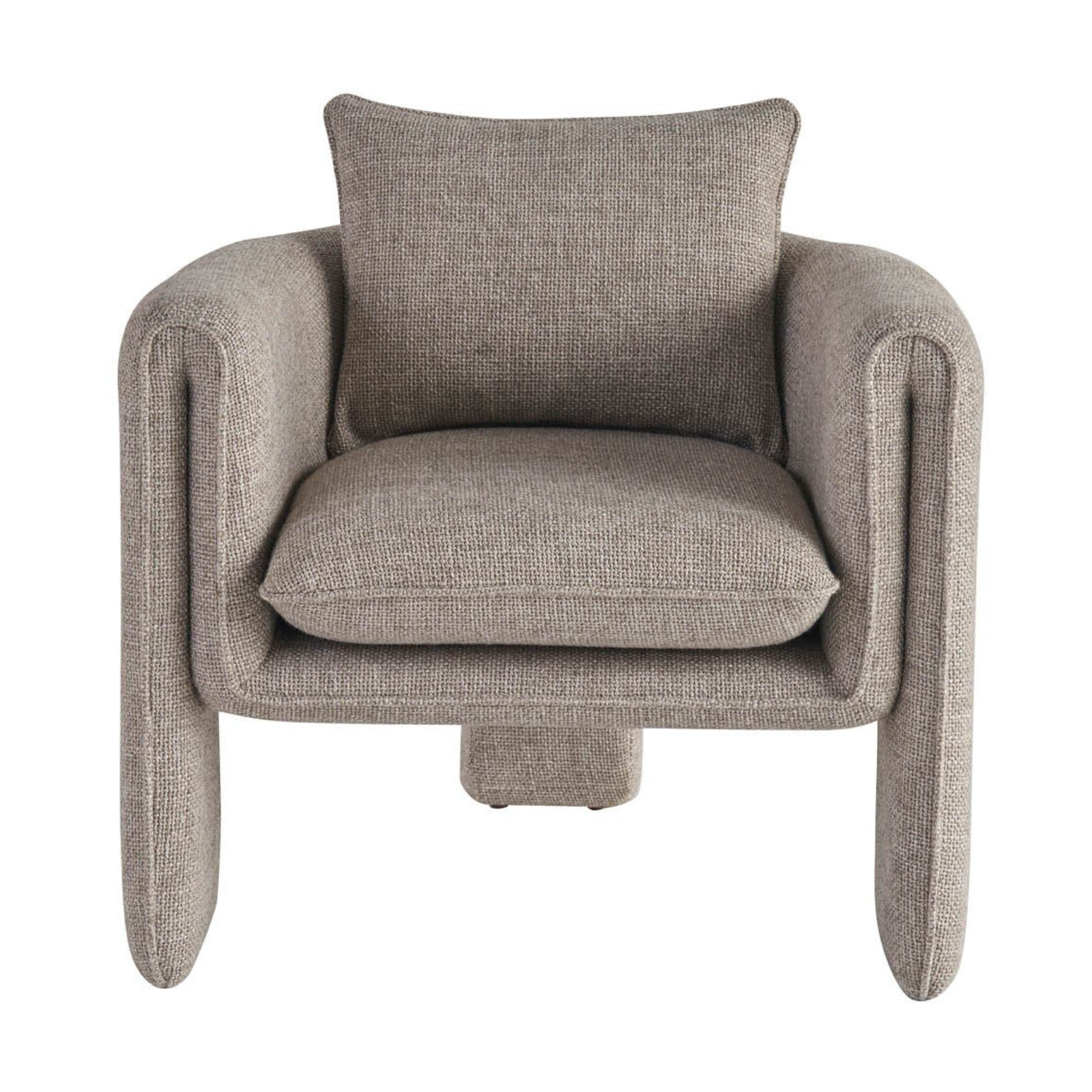 This accent chair, upholstered in the serene Melic Dune fabric, captivates with its abstract silhouette. Resting on an unconventional trio of legs, this chair is a masterful blend of curves and angles, creating a dynamic visual statement. This fusion of forms results in a piece that is as much a work of art as it is a functional seat, perfect for adding a touch of intrigue to any modern space.