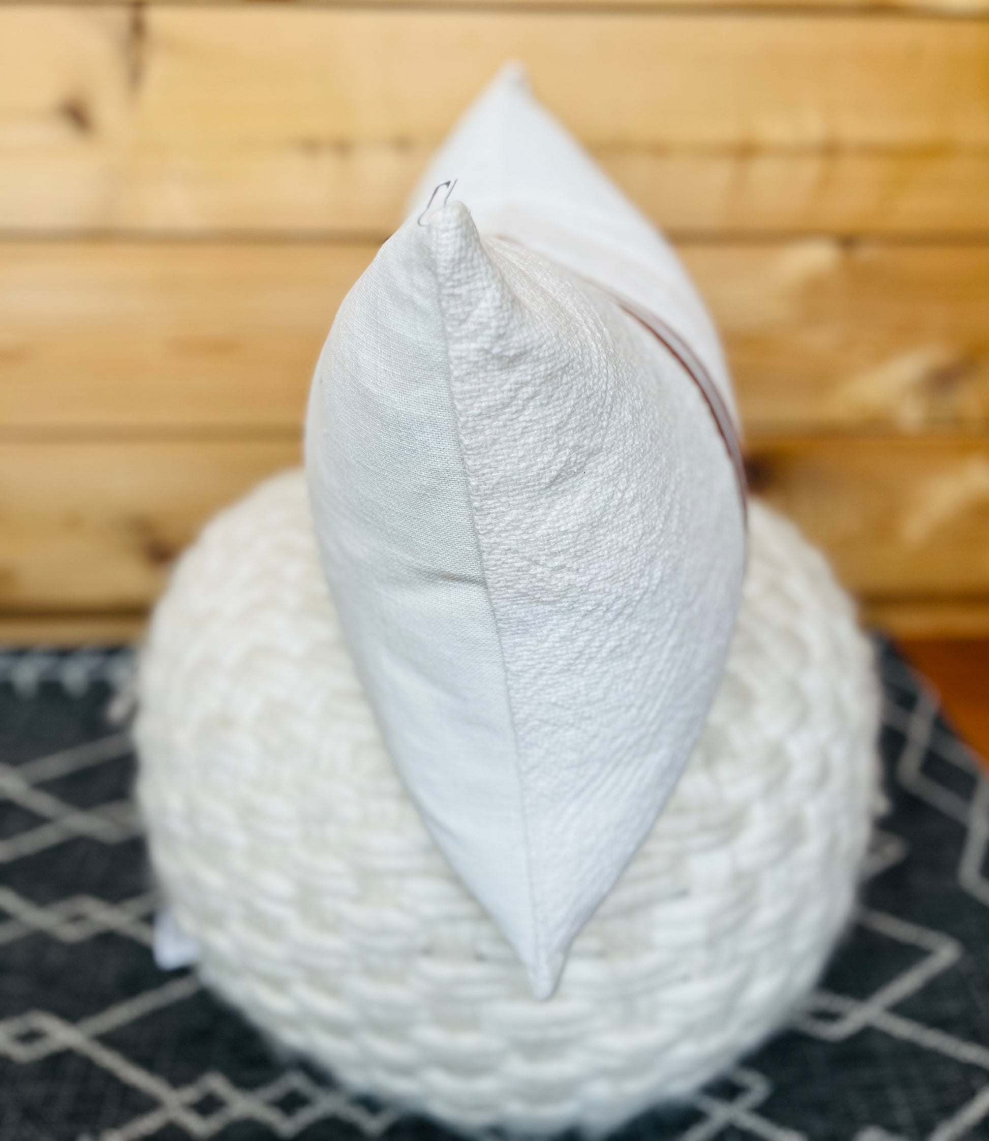 This cotton and Belgian flax linen pillow features a woven polyester tape applique in sangria red on a textured solid base.