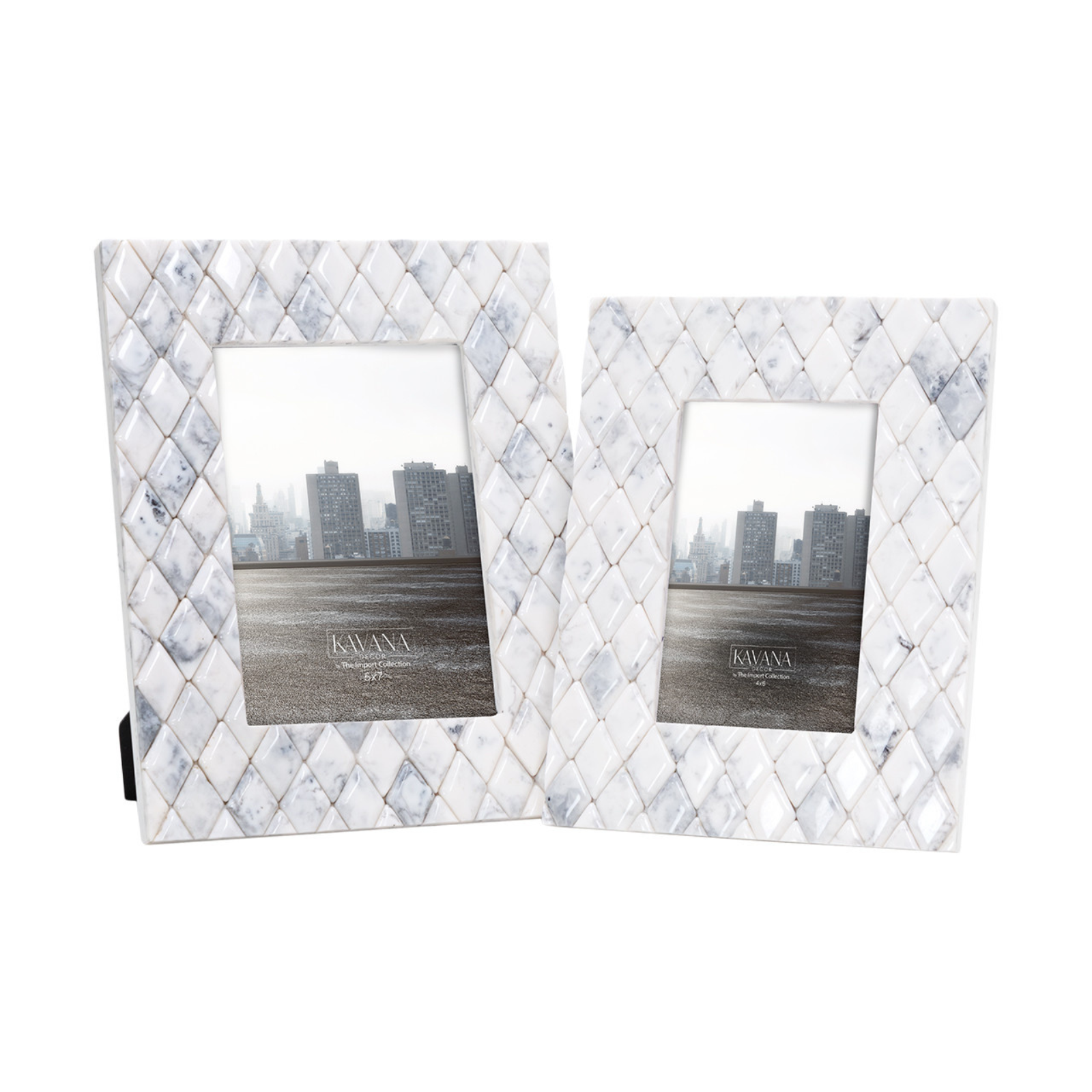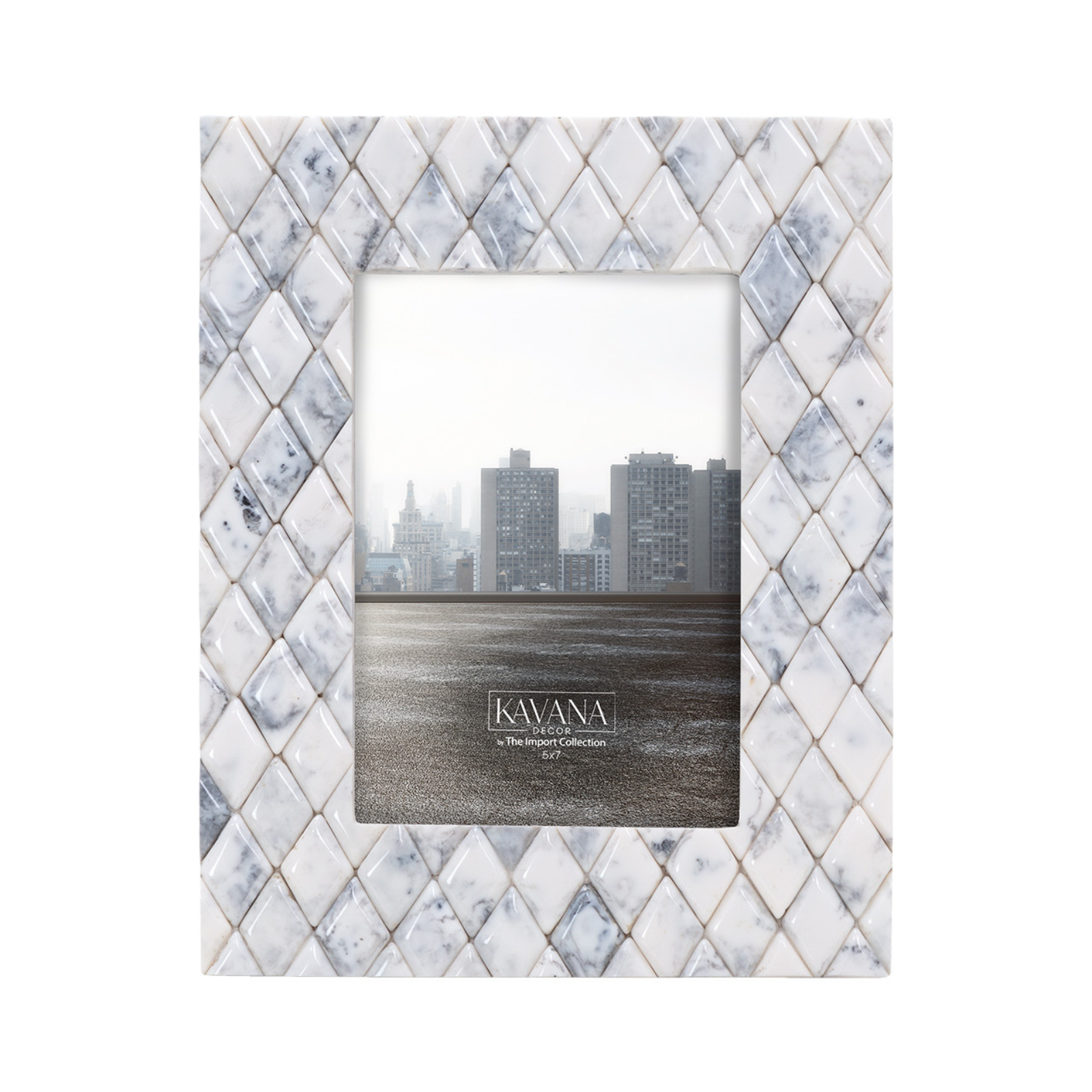 This frame brings sophisticated elegance to any interior design project with its distinctive diamond-patterned facade. These versatile photo frames showcase a harmonious blend of gray and white marble-like textures that complement both modern and traditional decor schemes. Crafted from resin, the frame offers exceptional durability while maintaining its refined appearance. The geometric diamond motif creates visual interest and depth, making it an ideal accent piece for retail displays, hospitality environments, or residential staging. Suitable for both tabletop placement and wall mounting.