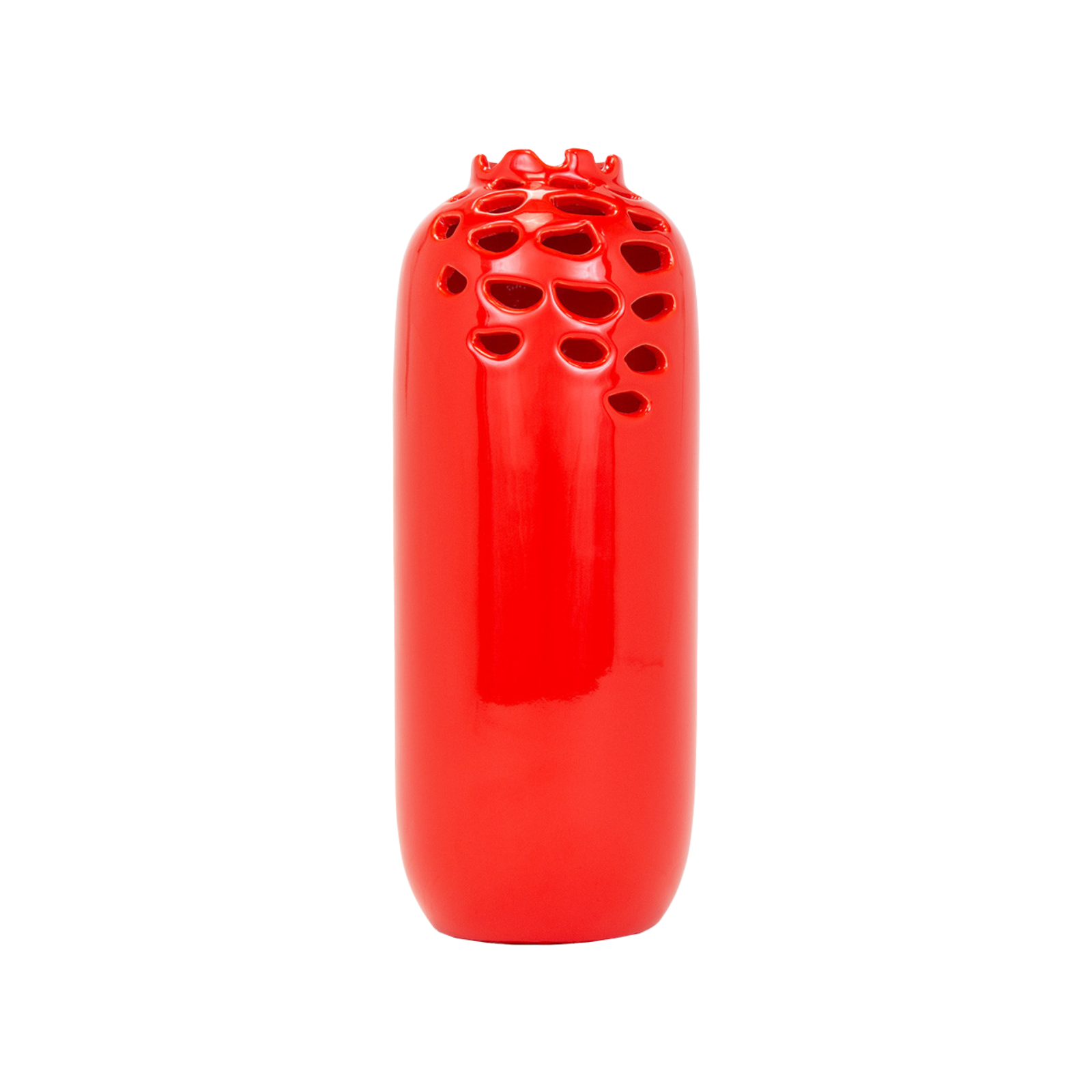 This modern ceramic vessel features an innovative design with distinctive oval cutouts along its upper portion, creating an artistic interplay of light and shadow. The vase's sleek, elongated silhouette and glossy finish add a touch of sophistication to your decor, while its sculptural quality allows it to serve as both a functional vase and a standalone art piece. Perfect for displaying tall stemmed flowers or dried arrangements, it also makes an eye-catching accent piece on its own. The vase's clean lines and dramatic profile make it an ideal centerpiece for a dining table, console, or mantel, where it can complement both modern and transitional interior styles. The rich red coloring adds warmth and energy to any space, making it particularly impactful against neutral backgrounds or as part of a curated color story in your room's design scheme.