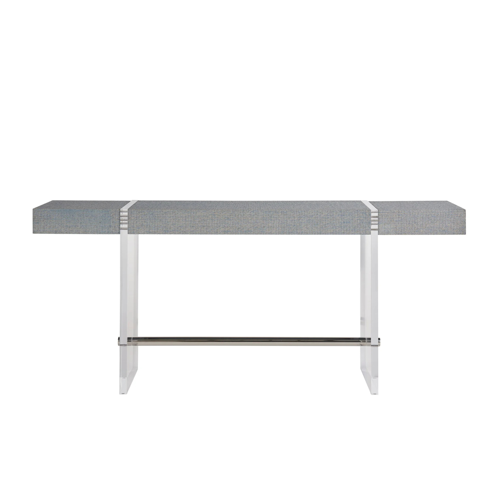 Modern Beach Glam ! This sleek console has a top covered in a light blue seagrass cloth creating a textural contrast to the sleek lucite legs. There is also an additional silver lower cross bar.